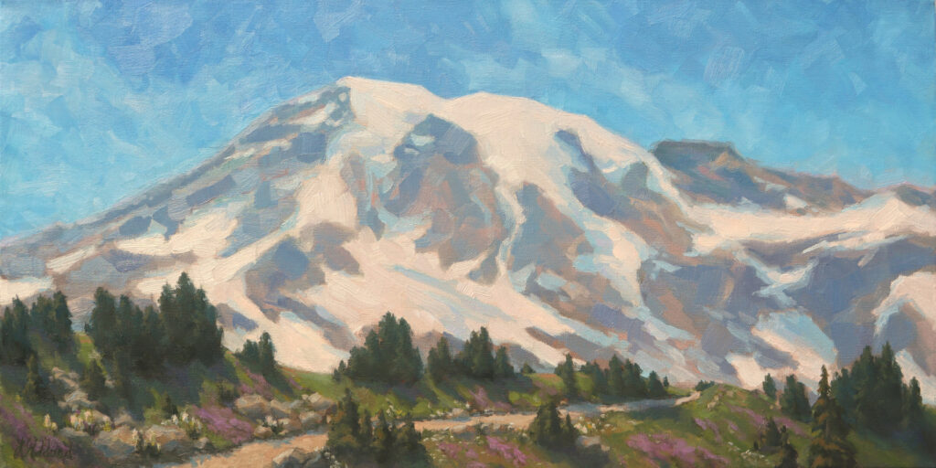I’ve been working on some larger studio paintings for the past month, including this view of Mount Rainier. Like all of my studio landscapes, it’s based on a plein air piece—this one was from a trip we took to Rainier last summer. The angle is a little different from the view I chose to paint, but it gave me the information I needed, especially in the color of the rocks. From the lowlands, the non-snow-covered parts of Rainier look pure blue, but up close, there is a surprising amount of pink in the rocks.