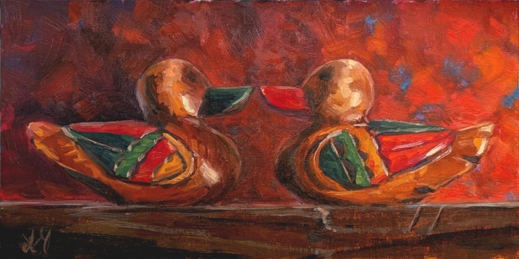 Early this month, I worked on two “red” themed pieces for a show at Willard Art and Frame in Bothell, and I’m delighted to say that both were selected for inclusion! Here is my favorite of the two, a still life of two wooden ducks I bought in Korea. These are wedding ducks, given to couples for luck, and it was so fun to recreate them in paint!